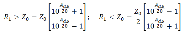 Pasternack 反射衰减器计算器 用于确定反射衰减器的两个可能的电阻值 (R1 > Z0 & R1 < Z0) (单位为欧姆)。按CTRL + D 将本页收藏或加入书签。