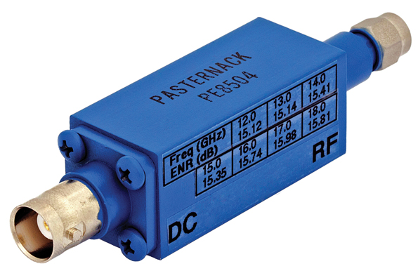 The model PE8504 amplified noised source has a frequency range of 12 to 18 GHz with a 15.5-dB ENR output.