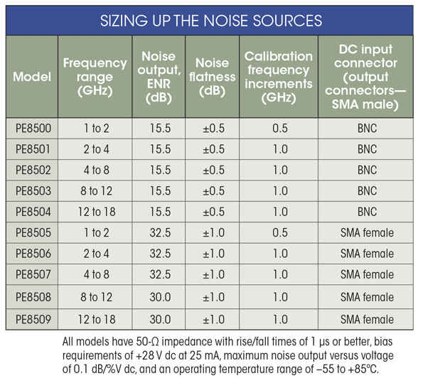 The ENR values also correlate well with the standard calibration points of noise-figure meters and RF/microwave spectrum analyzers. The 15-dB ENR models are perhaps the most versatile, as they can be used for measurement of both low and high noise figures, while the 30- and 32.5-dB models are best suited for high-noise-figure test scenarios. The noise sources exhibit VSWRs of either 1.20:1 or 1.35:1, and feature rise/fall times of 1 µs or better.